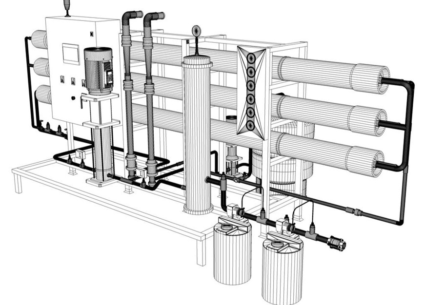 The system architecture integrates pre-treatment, reverse osmosis, and optional post-treatment stages in a clearly structured, industrial-grade design. The modular configuration allows systems to be adapted project-specifically to varying feed water qualities, throughput requirements, and levels of automation — without changing the fundamental operating principle or control logic.